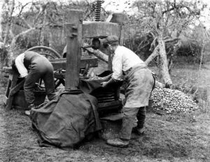 The cheese was then pressed to extract the juice, originally using single screw presses made from oak, but later with double screw metal presses. The resulting solids (known as pomace) were not wasted but fed to animals leading to many entertaining stories of drunken pigs and chickens staggering round the farmyard. The extracted juice was then decanted into oak barrels (traditionally brandy barrels) and left to ferment, relying on the wild yeasts already present in the juice, although many cider makers swore by adding some rather unsavoury ingredients including pieces of meat or (allegedly) even dead rats to encourage the fermentation. The call of the first cuckoo was said to be the traditional sign to open the barrels. For a more refined cider a second fermentation could be started and the cider cleared using various methods – one of which was apparently a bag of pig’s blood!