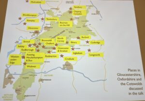 A good turnout on an autumnal evening to hear local storyteller, writer and speaker Kirsty Hartsiotis talk about Arts & Crafts in Cotswold Churches. Kirsty began by distinguishing between those older churches with Arts & Crafts interiors or features and those churches entirely designed and built by craftsmen (and women!) from the Arts and Crafts Movement, which is generally considered to have started around the 1890s and continued into the 1920s, though its influence continued for some time afterwards. Kirsty then showed us a slide (reproduced below with her kind permission) of all the places she would be discussing in her talk, which she considered to have an Arts & Crafts heritage.